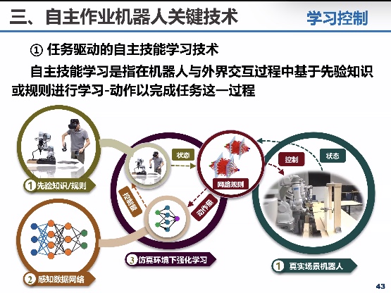 此次报告的题目为“智能自主作业机器人关键技术及发展趋势”,主要介绍了智能自主作业机器人作为一种兼具智能自主能力与主动作业能力的机器人系统,其在工业智能制造、精准农业、国防军事、太空探索等领域具有广泛的应用。报告从研究背景与意义、研究现状与面临挑战、关键技术等方面介绍自主作业机器人的现实发展与未来趋势。首先,以社会需求和学科特点阐述自主作业机器人研究的背景意义与面临的挑战性问题;其次介绍了目前自主作业机器人总体技术路线与关键科学问题,包括机构设计、环境感知、自主学习控制等方面;最后介绍了自主作业机器人未来的发展趋势与展望。